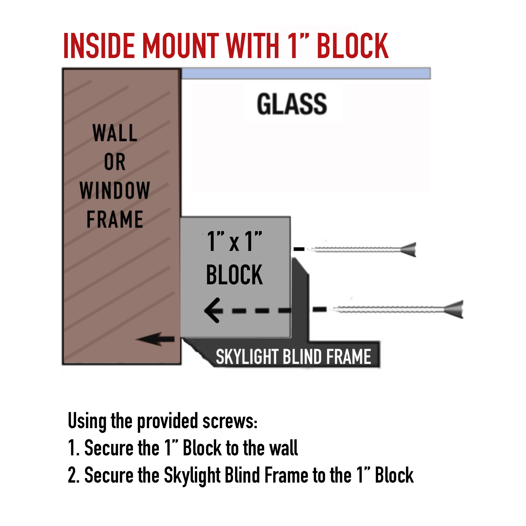 Montage extérieur avec bloc de 1 pouce : mesurez la largeur et la hauteur du cadre de la fenêtre. Ajoutez au moins 2 pouces supplémentaires à la largeur et à la hauteur pour accueillir le cadre du store de lucarne de 1 pouce. Pour une installation plus sûre, ajoutez 4 pouces supplémentaires à la largeur et à la hauteur.